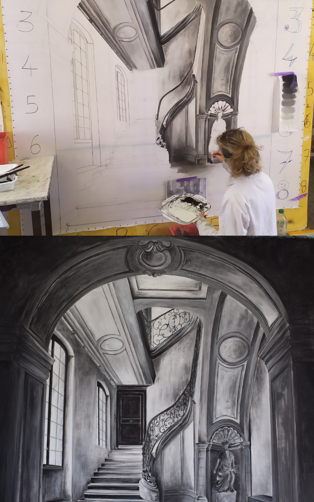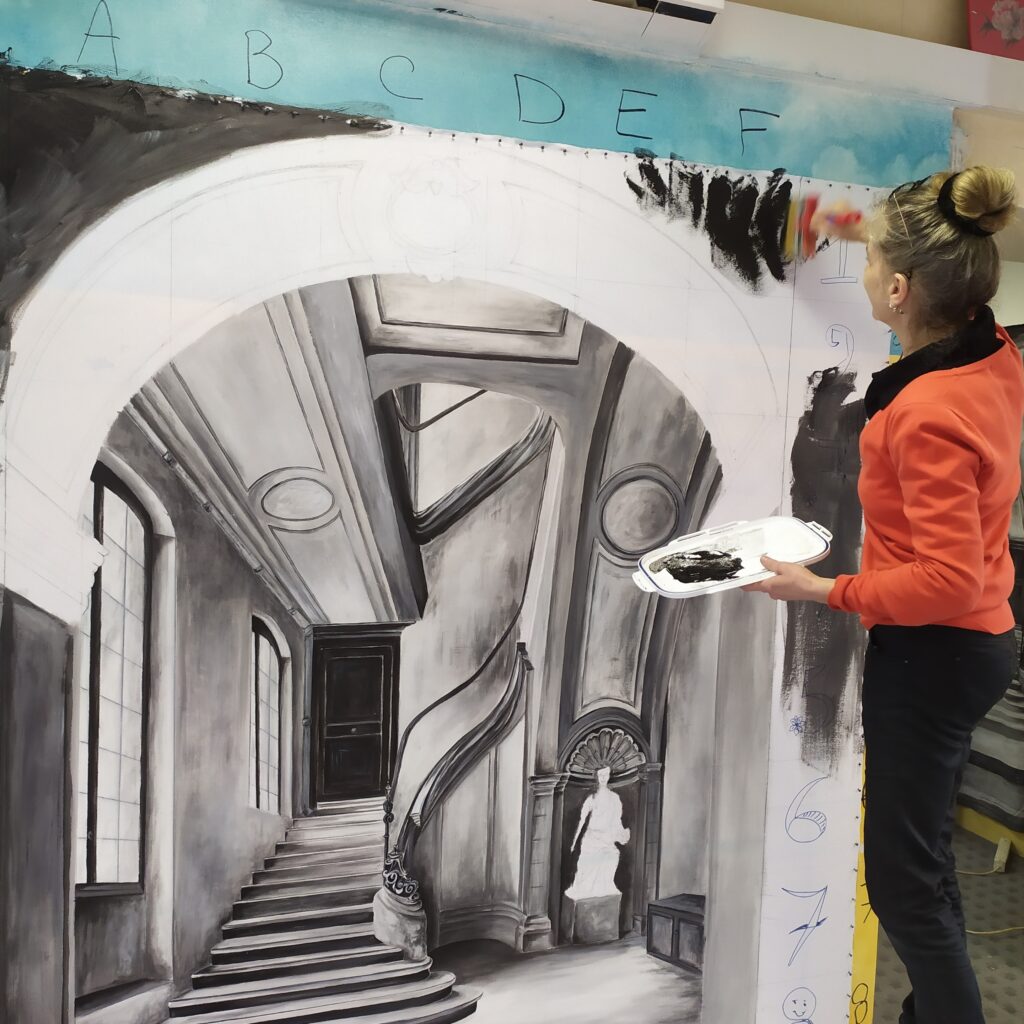 1- Réalisation d'une fresque trompe-l'oeil décor de théâtre, peinture à la gigouille.